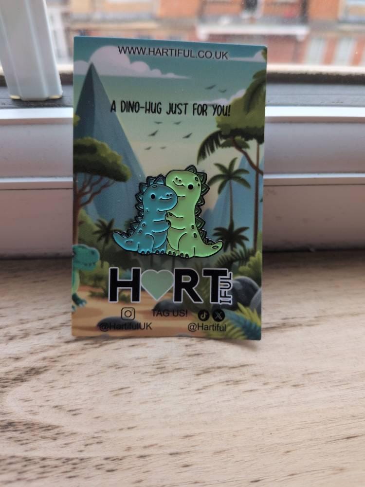 The pin has two clasps on the back ensures that it stays in place, so you don't have to worry about losing your beloved pin. This Hugging Dinosaurs Pin is perfect for gifting to a friend who loves fun and quirky things, and comes on the cutest backboard - "Sending you a dino-hug"