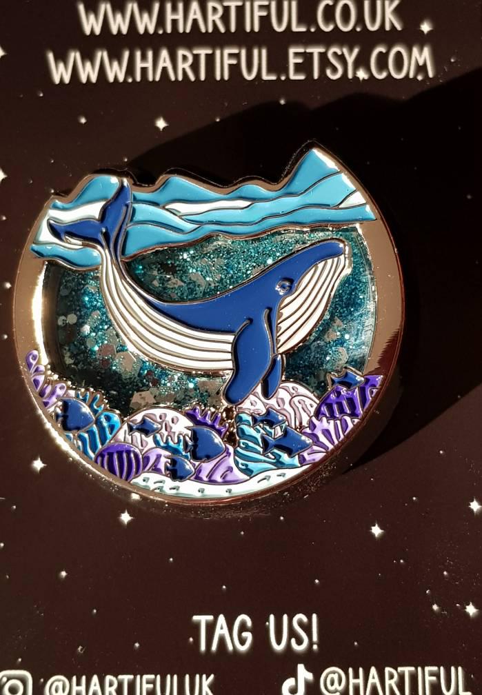 Make a splash with this dreamy shaker whale enamel pin – a stunning under-the-sea design featuring moving glitter “bubbles” that swirl and shimmer like ocean magic. Crafted from silver metal and measuring a generous 40mm, this pin is a soothing and eye-catching accessory perfect for enamel pin collectors and ocean lovers alike.