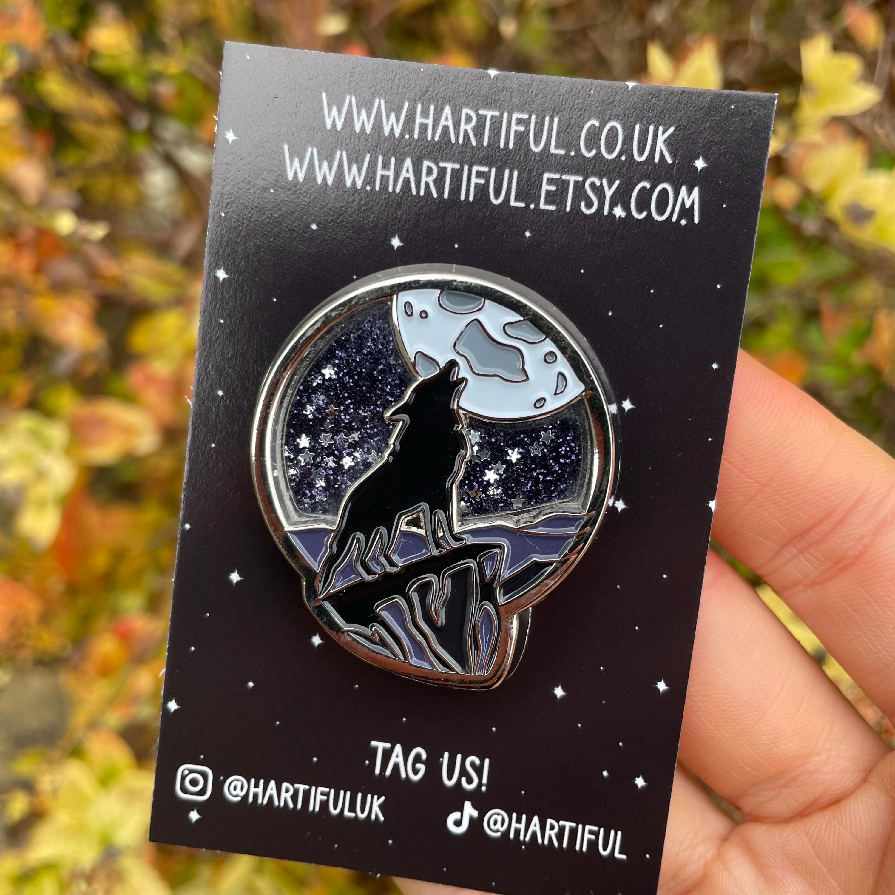 Let your wild side shine with this Wolf Howling to the Moon Enamel Pin, featuring a mesmerizing moving black glitter sky filled with stars. The glitter background shimmers and shifts as you move it, creating a magical celestial effect behind the howling wolf.