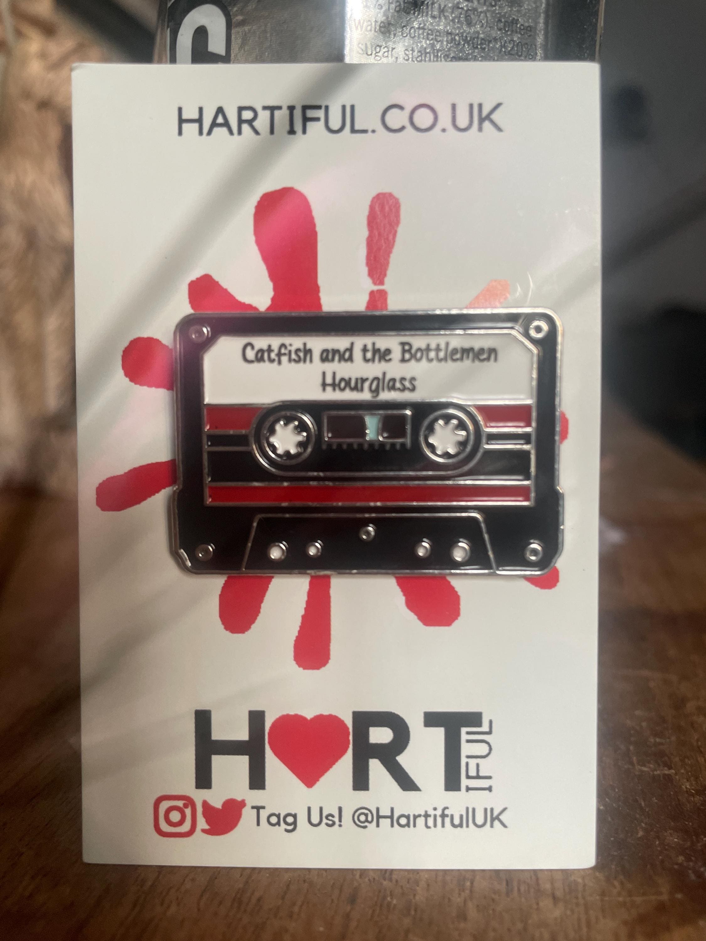 This 40mm soft enamel pin is a cassette design made with silver metal and bold black, red, and white enamel details. Each pin comes with a double pin back for extra security — perfect for jackets, bags, lanyards, or pin boards.