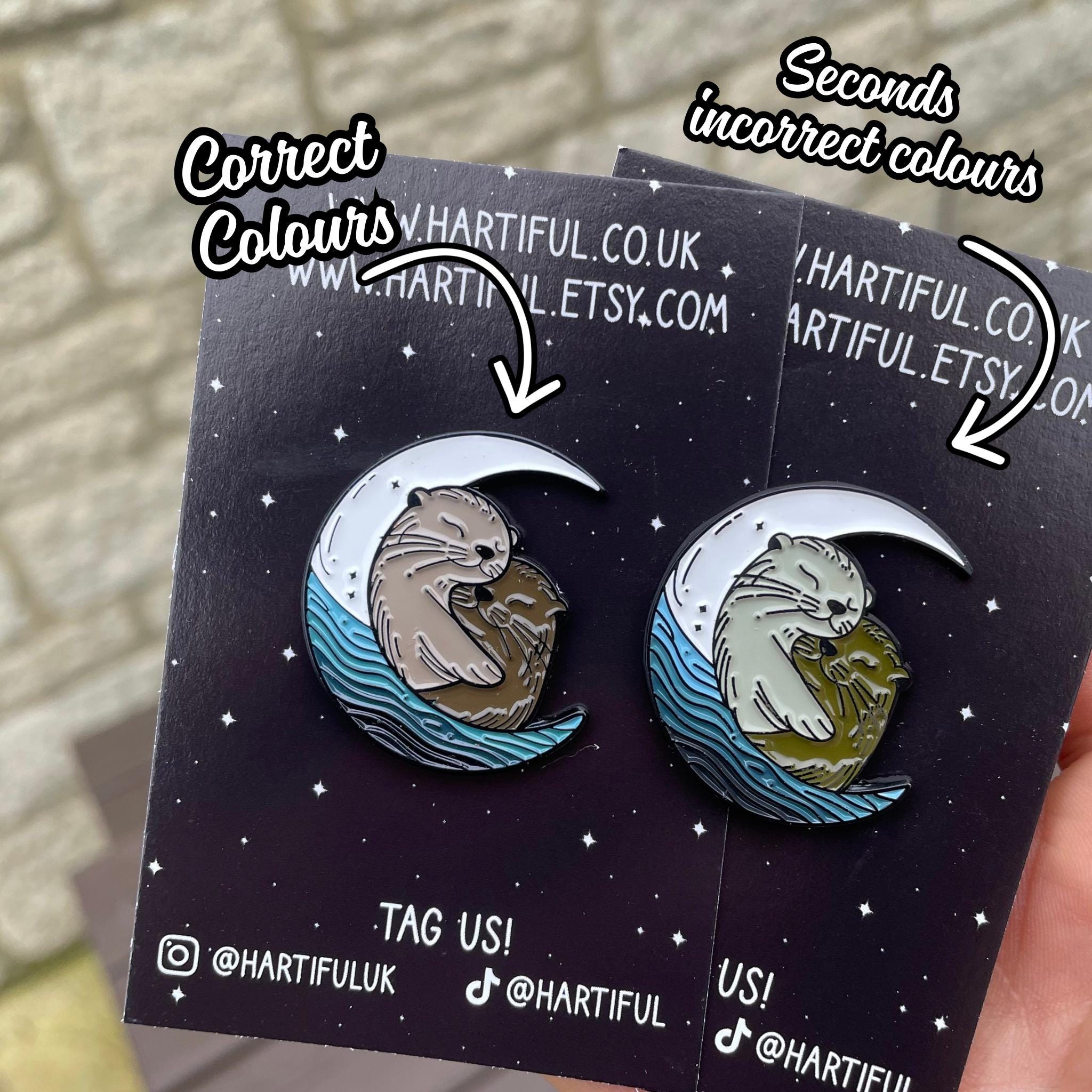 This adorable enamel pin captures two otters hugging with the moon as a backdrop - an adorable pin for any bag, jacket, or backpack.